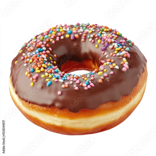 Chocolate donut topped with colorful sprinkles, glazed, on a white background