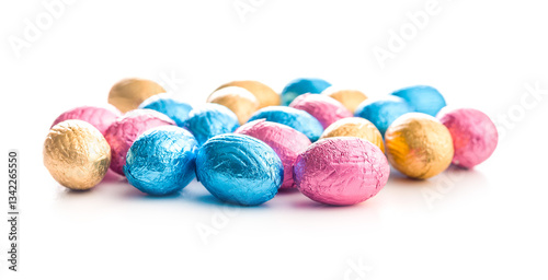 Chocolate easter eggs wrapped in multi colored foil isolated on white background.