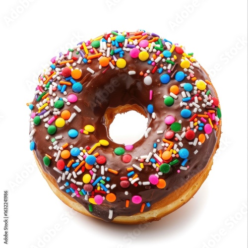 Chocolate frosted donut, topped with colorful sprinkles and candy