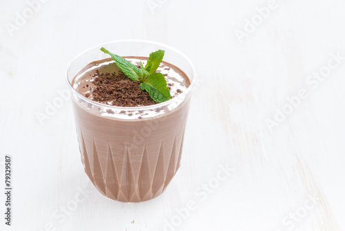 chocolate milkshake in a glass on white wooden table