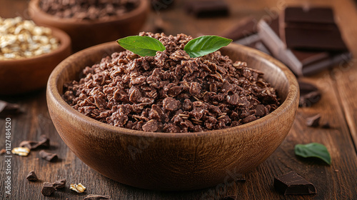 Chocolate oats breakfast, carbohydrate rich food, healthy dessert meal, delicious diet friendly snack, sweet oatmeal with cocoa, nutritious homemade treat on background.
