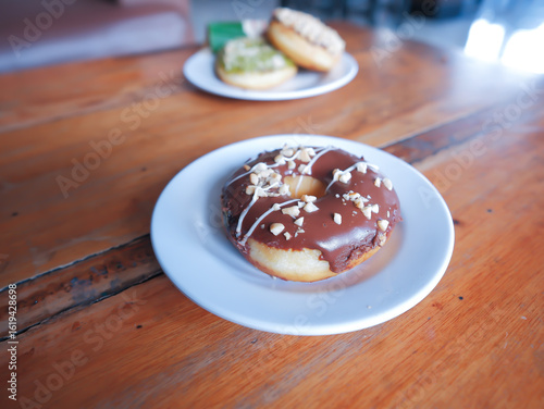 Chocolate peanut flavor donut, served in a white plate, side view