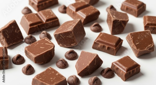 Chocolate pieces and chips arranged on a clean white surface during a bright daylight setting