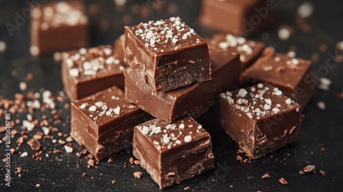 Chocolate pieces with sea salt sprinkles, artistic arrangement, dark background