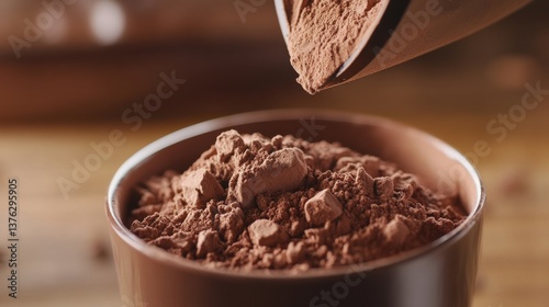 Chocolate Protein Powder Being Poured Into Measuring Cup