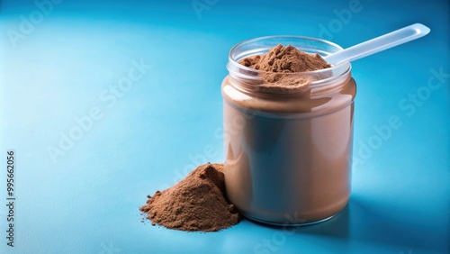 Chocolate protein powder in scoop and plastic jar on blue background, chocolate, protein powder, scoop, jar, blue