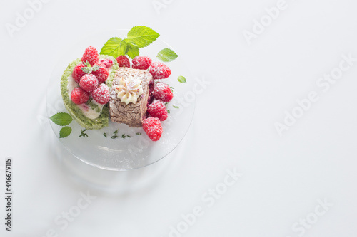 chocolate roll with raspberries and mint leaves on glass plate on white table