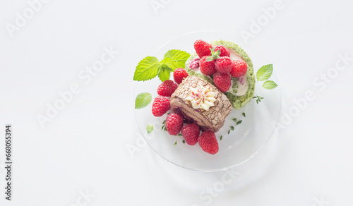 chocolate roll with raspberries and mint leaves on glass plate on white table