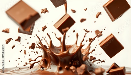 Chocolate splash, liquid chocolate explosion, flying chocolate squares, cocoa beans, high-speed photography, white background, dynamic composition, brown tones