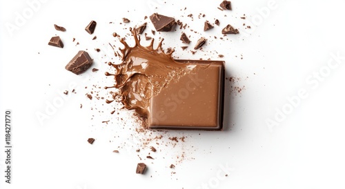 Chocolate Square with Melting Liquid and Flying Pieces. Isolated on White Background.