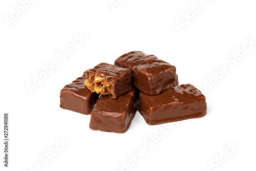 Chocolate sweet with caramel and peanut isolated on white background.