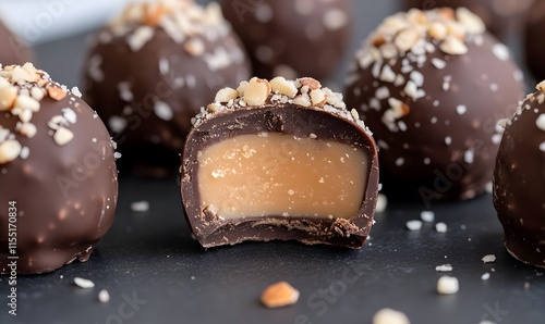 chocolate truffles covered in caramel and coated with coarsely chopped almonds, Generative AI