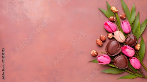Chocolate Tulips and Hazelnuts - Pink tulips, chocolate candies, and hazelnuts arranged on a textured pink background. Perfect for spring or Easter themes