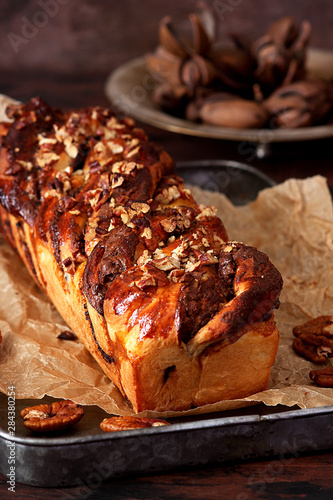 Chocolate yeast cake babka with pecans