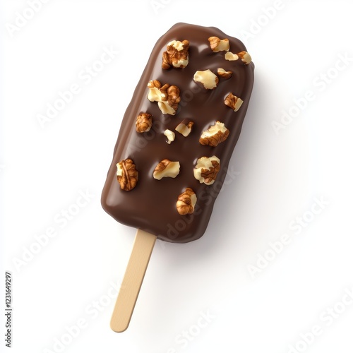 Chocolate-covered vanilla ice cream stick with crunchy nuts, isolated on a clean white background