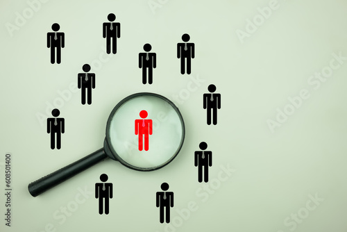 Choosing a good leader. Search with a magnifying glass. Leadership development, recruitment and prospecting concept, HRM or Human Resource Management. Selection boss