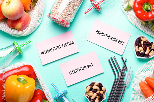 Choosing between popular diets for weight loss with fresh fruits, nuts and vegetables in background. Stickers with popular diet names on blue, healthy lifestyle concept, flat lay, top view