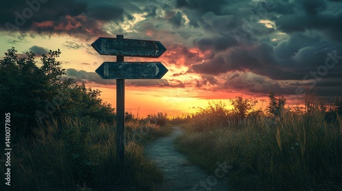 Choosing Direction Rustic Sign on Nature Path at Dramatic Sunset