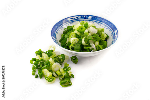 chopped spring onion, scallions, in a blue dish on white background