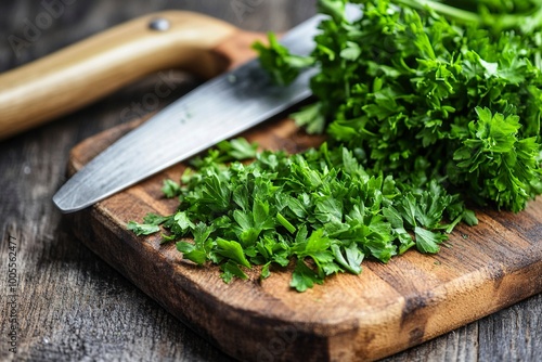Chopping Fresh Parsley on Wooden Board, Cooking Action. Close-up, shallow dof. generative ai