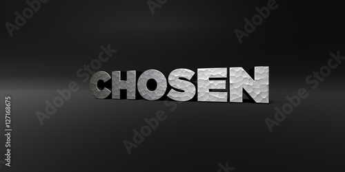 CHOSEN - hammered metal finish text on black studio - 3D rendered royalty free stock photo. This image can be used for an online website banner ad or a print postcard.