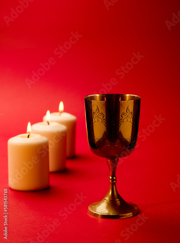 christian chalice on bible by burning candles red background