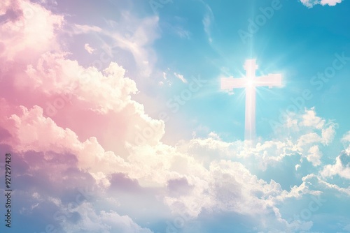 Christian cross appeared bright in the sky with soft fluffy clouds, white, beautiful colors. With the light shining as hope, love and freedom in the sky background , ai