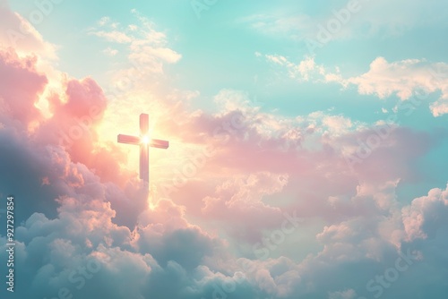 Christian cross appeared bright in the sky with soft fluffy clouds, white, beautiful colors. With the light shining as hope, love and freedom in the sky background , ai