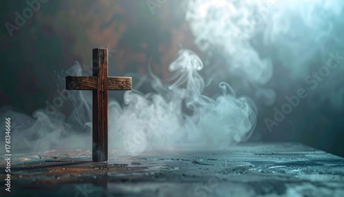 Christian cross on the table with a smoke background.