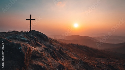Christian cross standing on a hill during sunrise. Ascension of Jesus concept. Beautiful nature during sunrise or sunset. Cross on top of a hill, Christianity theme.