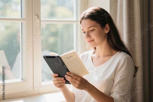 Christian woman reading Psalms on e-reader by the window, morning sunlight