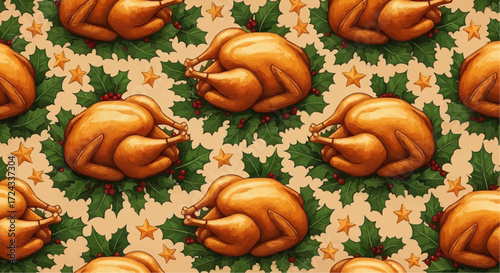 Christmas seamless thanksgiving pattern with roasted turkey holly and stars for holiday backgrounds and designs ideas vector