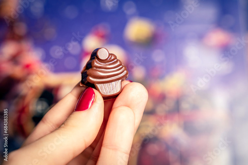 Christmas advent calendar chocolate cupcake in a hand, December, blue festive bokeh bg