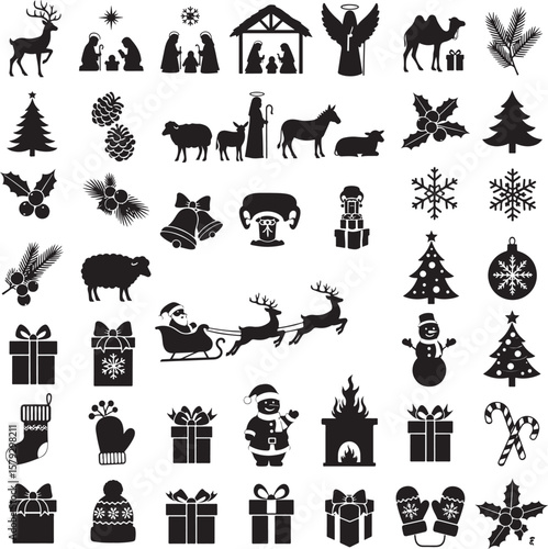 Christmas and Nativity Scene Black Silhouette Vector Icons Collection.