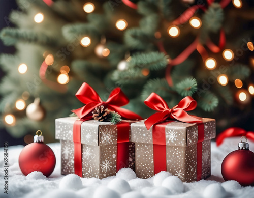 Christmas and New Year background with gift boxes decorated with red ribbon, red balls and Christmas tree on snow