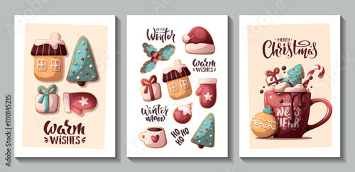 Christmas and New Year card set with gingerbread cookies and hot chocolate. Vector illustration for greeting cards, banners, posters, postcard.