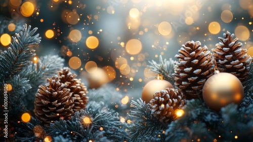 Christmas and New Year holidays background. Christmas tree with golden baubles and lights bokeh background. Space for text. Copy space. Greeting card.