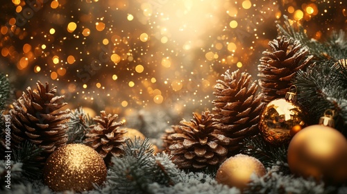Christmas and New Year holidays background. Christmas tree with golden baubles and lights bokeh background. Space for text. Copy space. Greeting card. Artistic blur