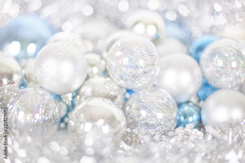 Christmas and New Year pattern, ornament of Christmas balls and tinsel, winter fairytale decor in blue and silver color, lights bokeh close up macro