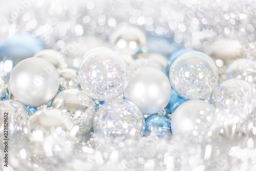 Christmas and New Year pattern, ornament of Christmas balls and tinsel, winter fairytale decor in blue and white color, lights bokeh