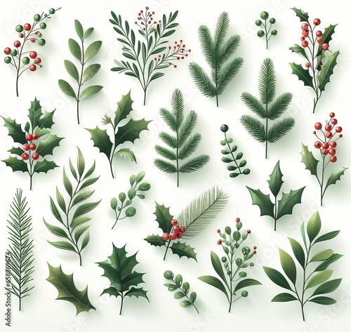 Christmas and New Year set with holly leaves, branches, berries and pine cones. Generated by AI