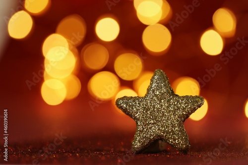Christmas and New Years season. Shiny star on red glitter background with shining bokeh. Christmas festive red background