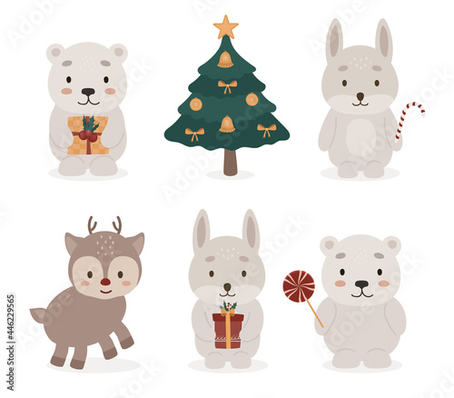 Christmas animals with gift box. Scandinavian Bear, rabbit, hare, deer, lollipop, candy. Christmas tree with Christmas decorations (star, ribbon, christmas ball, bell). New Year 2022.