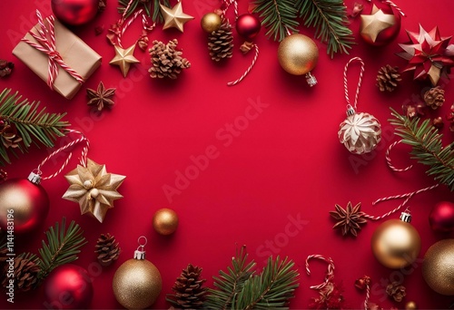 Christmas background with branches, decorations, balls, and cones in a festive winter setting