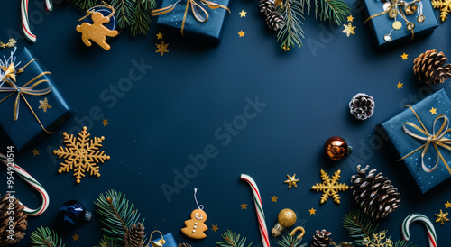 Christmas background with dark blue and gold-colored gift boxes, candy canes, gingerbread cookies, stars, and pine cones