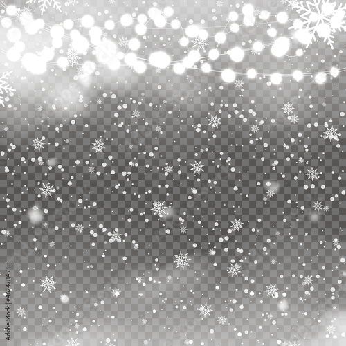 Christmas background with falling snowflakes on transaprent. Vector