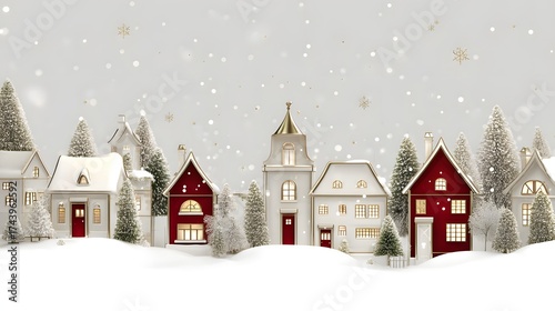 Christmas background with houses, trees, and snowflakes. Christmas miniature village with houses and trees in the snow