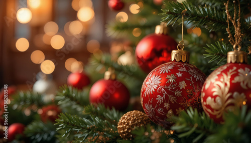 Christmas background with red and gold ornaments, pine branches, and bokeh lights, festive mood
