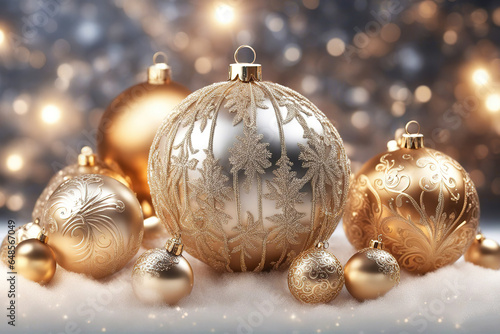 Christmas background with spruce branches decorated with Christmas baubles, snowflakes, and lights.