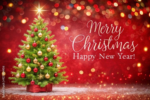 Christmas background with xmas tree and sparkle bokeh lights on red canvas background. Merry christmas card. Winter holiday theme.